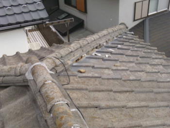 | 震災による屋根瓦が損傷・・・新規はコロニアル葺き・・・重い屋根か ら軽い屋根にすることにより躯体に負担がかからなくなります。 |
