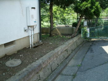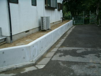 | 既存擁壁(大矢石)が劣化と周囲道路の沈下でゆがんで危険な状 態・・・既存擁壁を撤去し新たにRC擁壁を設置しました。 |